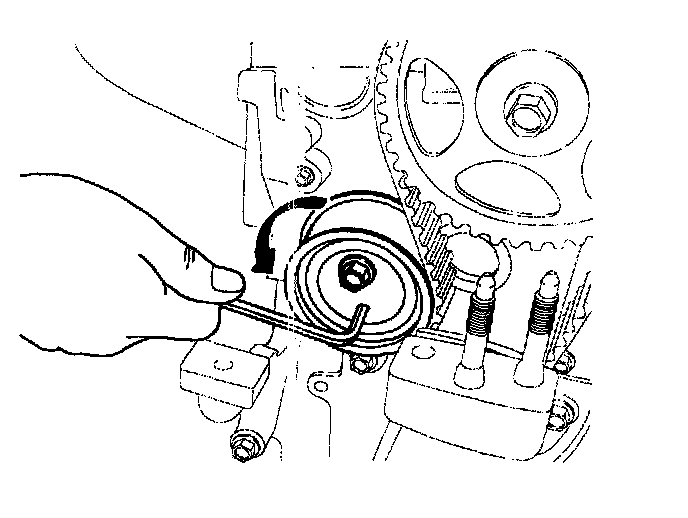 2) Give tension to timing belt by rotating tensioner in direction of the arrow with tool and set timing belt not to give slack to tension side.