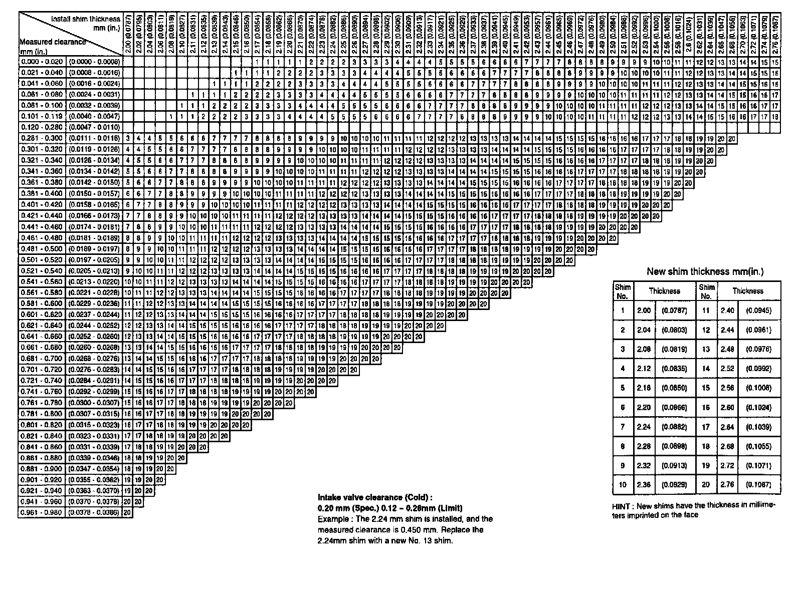 Adjusting Shim Selection Chart (Intake)