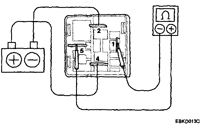 - Using an ohmmeter, check that there is continuity between terminals 2 and 4. If there is no continuity; replace the relay.
