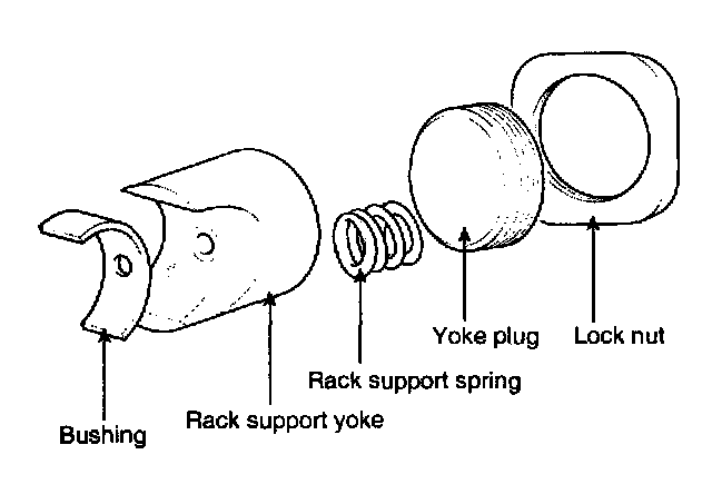 12. Remove the lock nut, yoke plug, rack support spring, rack support yoke and bushing from the gear box.