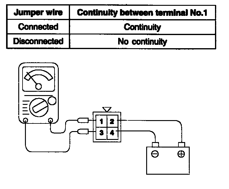 3. Check the continuity between terminal 1 and terminal 3 of the A/T control relay when the jumper wires are connected and disconnected from the battery.