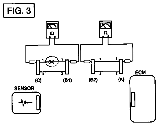 b. Disconnect connector (B), and measure for resistance between connector (C) and (B1) and between (B2) and (A) as shown in [FIG.3].