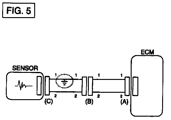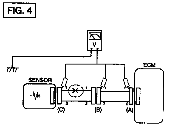 a. With each connector still connected, measure the voltage between the chassis ground and terminal 1 of each connectors (A), (B) and (C) as shown in [FIG.4].