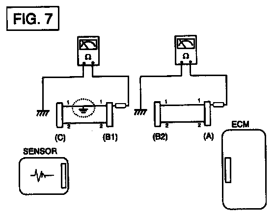 b. Disconnect connector (B), and measure the resistance between connector (A) and chassis ground, and between (B1) and chassis ground as shown in [FIG. 7].
