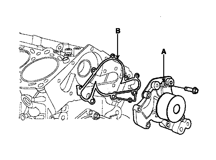 5. Remove the water pump. Remove the water pump (A) and gasket (B).