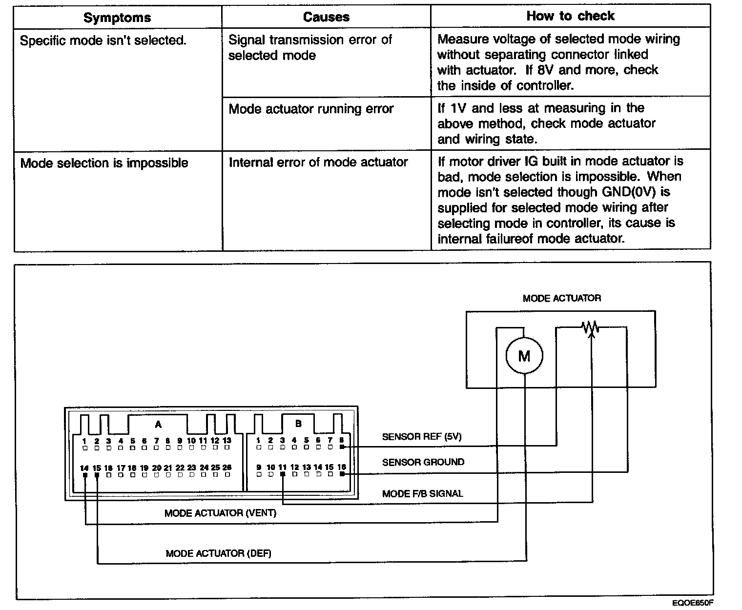 In turning on IG and selecting mode switch, sequential operation begins in order of Vent -> Bi-level -> Blower -> Mix. DIP mode works regardless of order at selecting it. In selecting Vent mode as mode switch, GND (0 V) is supplied for FATC connector A-14 (Vent) terminal. Voltage of 9 V and more is set in the rest terminal A-15 (DEF) and motor drive IG in mode actuator which receives the signal, works in direction of vent mode setup. Vent, Built-in-level, Blower, Mix and Defrost mode can be selected in the method described.