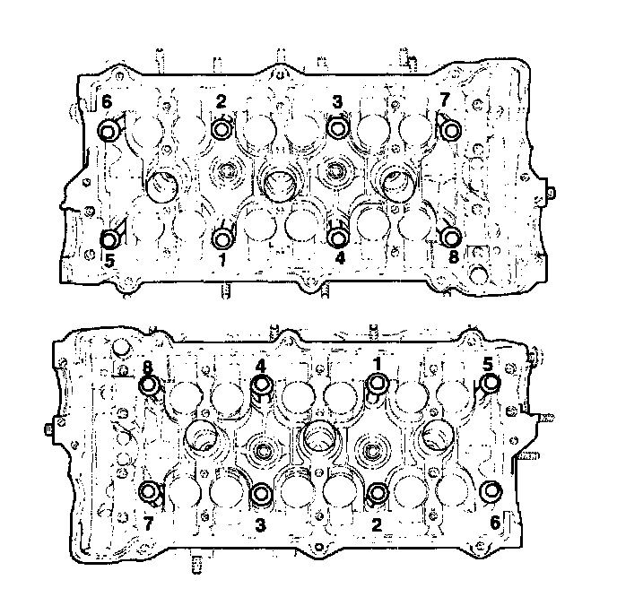 Install and uniformly tighten the cylinder head bolts on each cylinder head in several passes and in the sequence shown, then repeat for the other side, as shown.