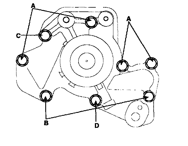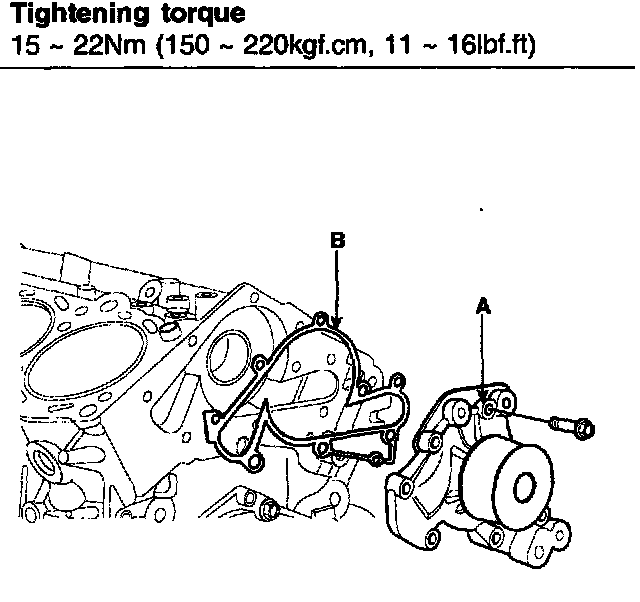Install the water pump (A) and a new gasket (B) with the 8bolts.