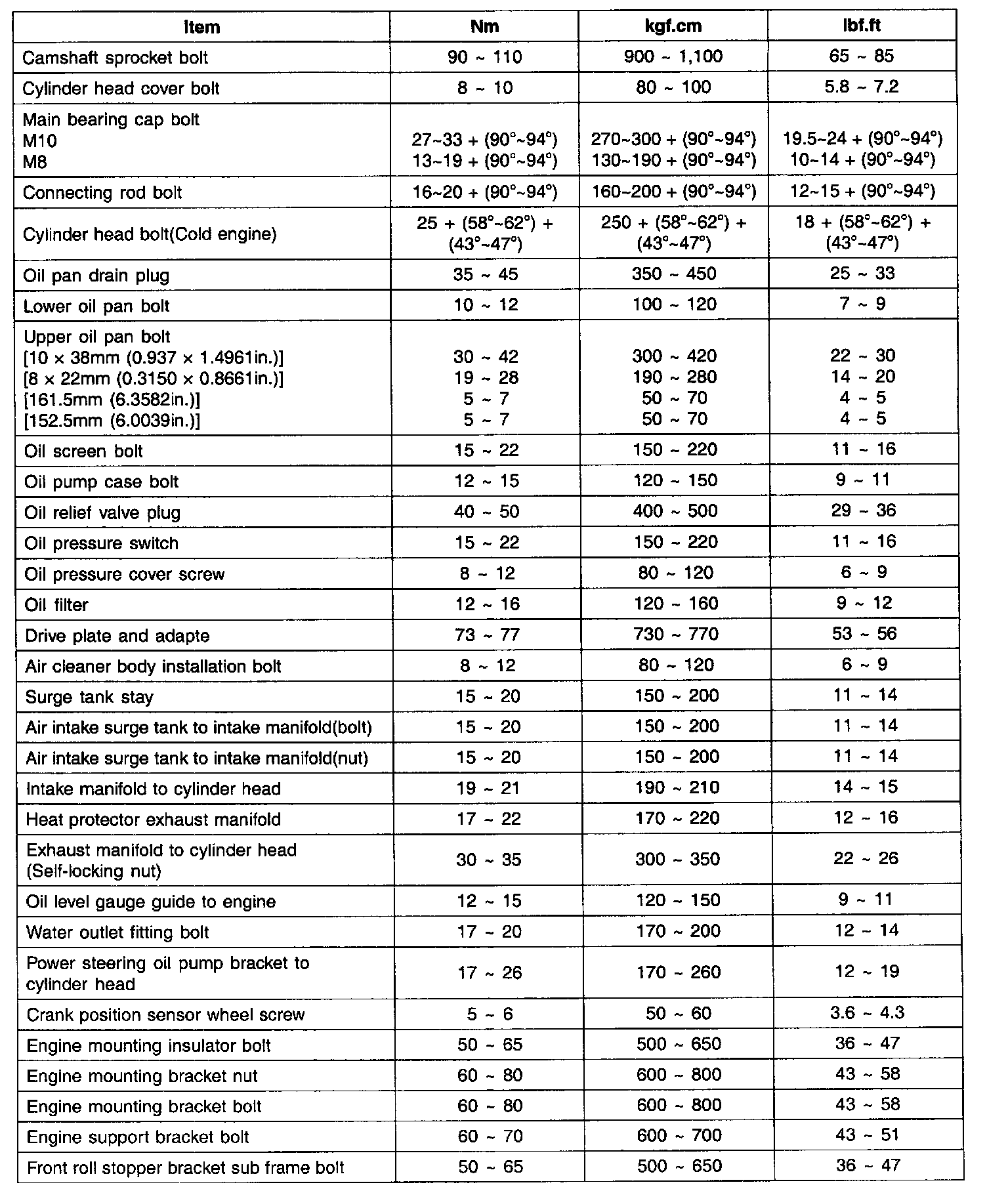 Tightening Torque 16 - 20 + (90° - 94°) Nm (160 - 200 + (90° - 94°) kgf-cm, 12 - 15 + (90° - 94°) ft. lbs.)
