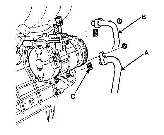 5. Remove the bolts, then disconnect the suction line (A) and discharge line (B) from the compressor. Plug (C) or cap the lines immediately after disconnecting them to avoid moisture and dust contamination.