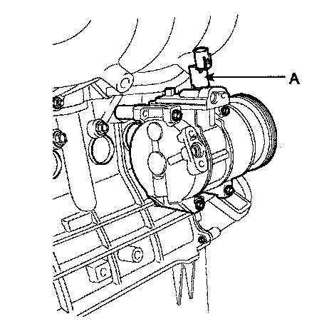 6. Disconnect the compressor clutch connector (A), and then remove 4 mounting bolts and the compressor.