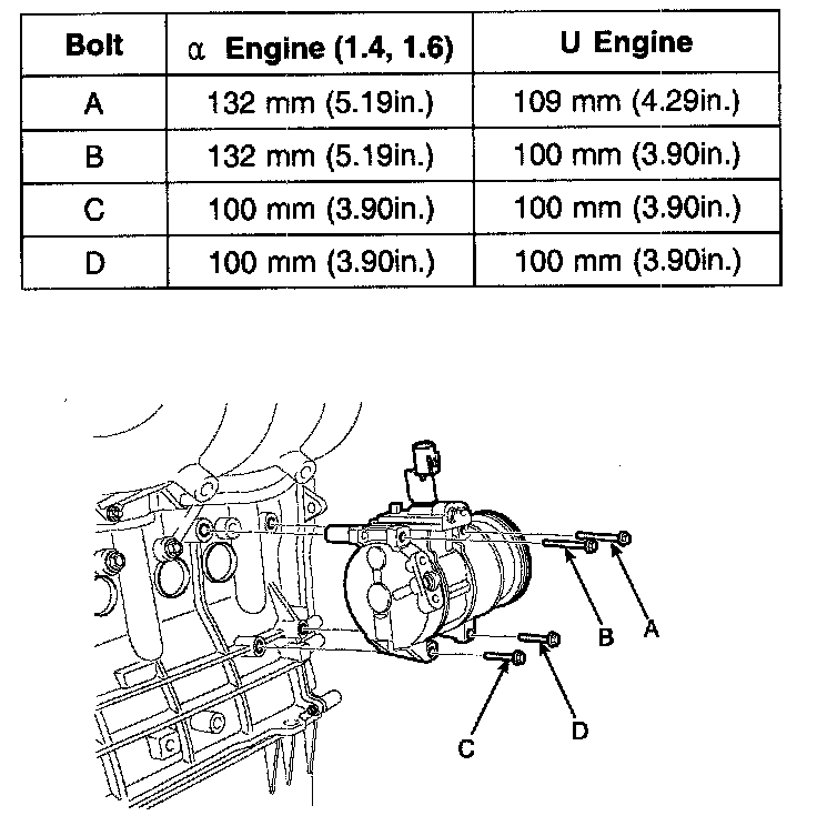 1. Make sure of the length of compressor mounting bolts, and then tighten it A->B->C->D order.