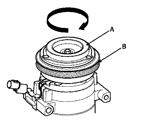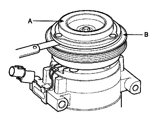 2. Check the pulley (B) bearing play and drag by rotating the pulley by hand. Replace the clutch set with a new one if it is noisy or has excessive play/drag.