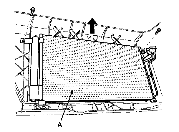 5. Remove 2 bolts, and then remove the condenser (A) by lifting it up. Be careful not to damage the radiator and condenser fins when removing the condenser.