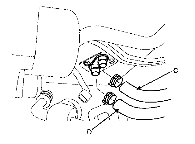 CAUTION: Engine coolant will run out when the hoses are disconnected; drain it into a clean drip pan. Be sure not to let coolant spill on electrical parts or painted surfaces. If any coolant spills, rinse it off immediately.