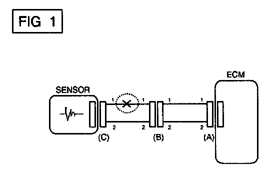In [FIG.2.] the measured resistance of line 1 and 2 is higher than 1 Mohm and below 1 ohm respectively. Specifically the open circuit is line 1 (Line 2 is normal). To find exact break point, check sub line of line 1 as described in next step.