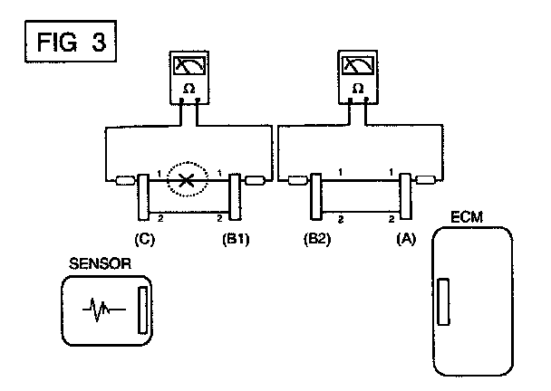 b. Disconnect connector (B), and measure for resistance between connector (C) and (B1) and between (B2) and (A) as shown in [FIG. 3].