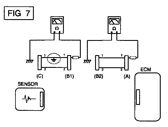 b. Disconnect connector (B), and measure the resistance between connector (A) and chassis ground, and between (B1) and chassis ground as shown in [FIG. 7].
