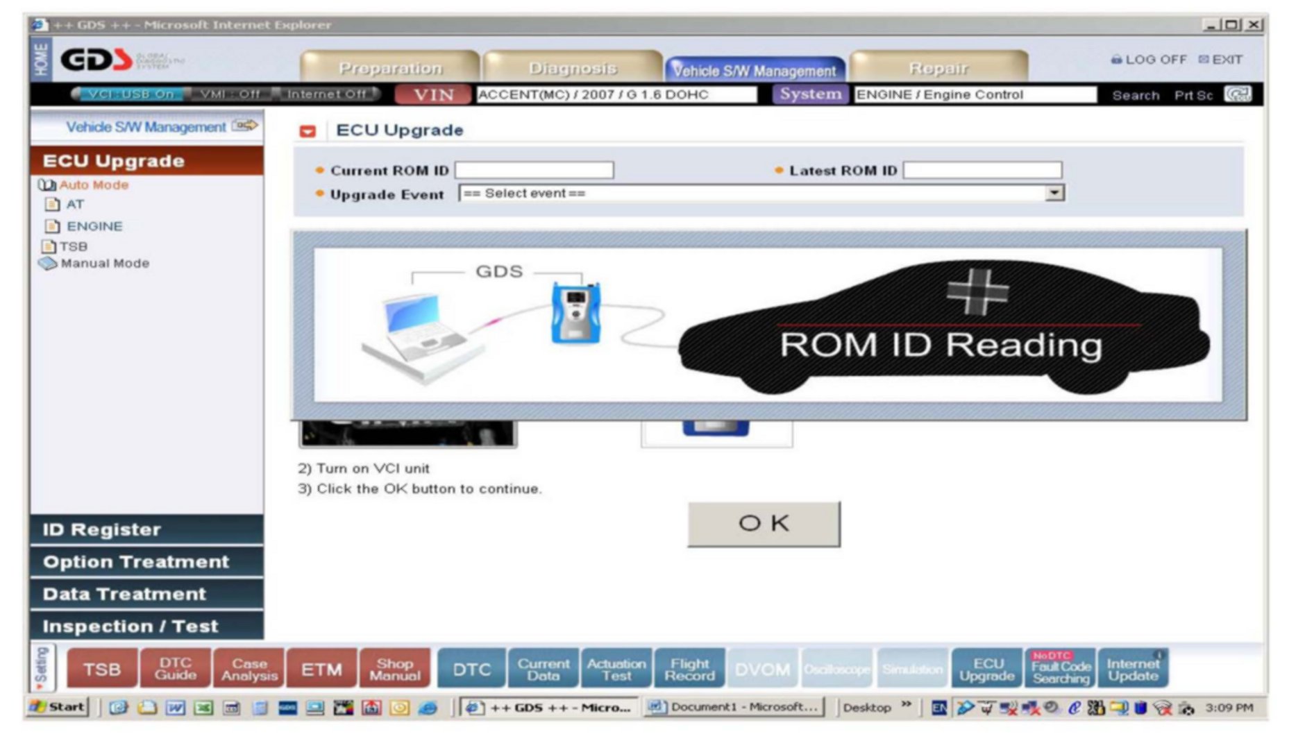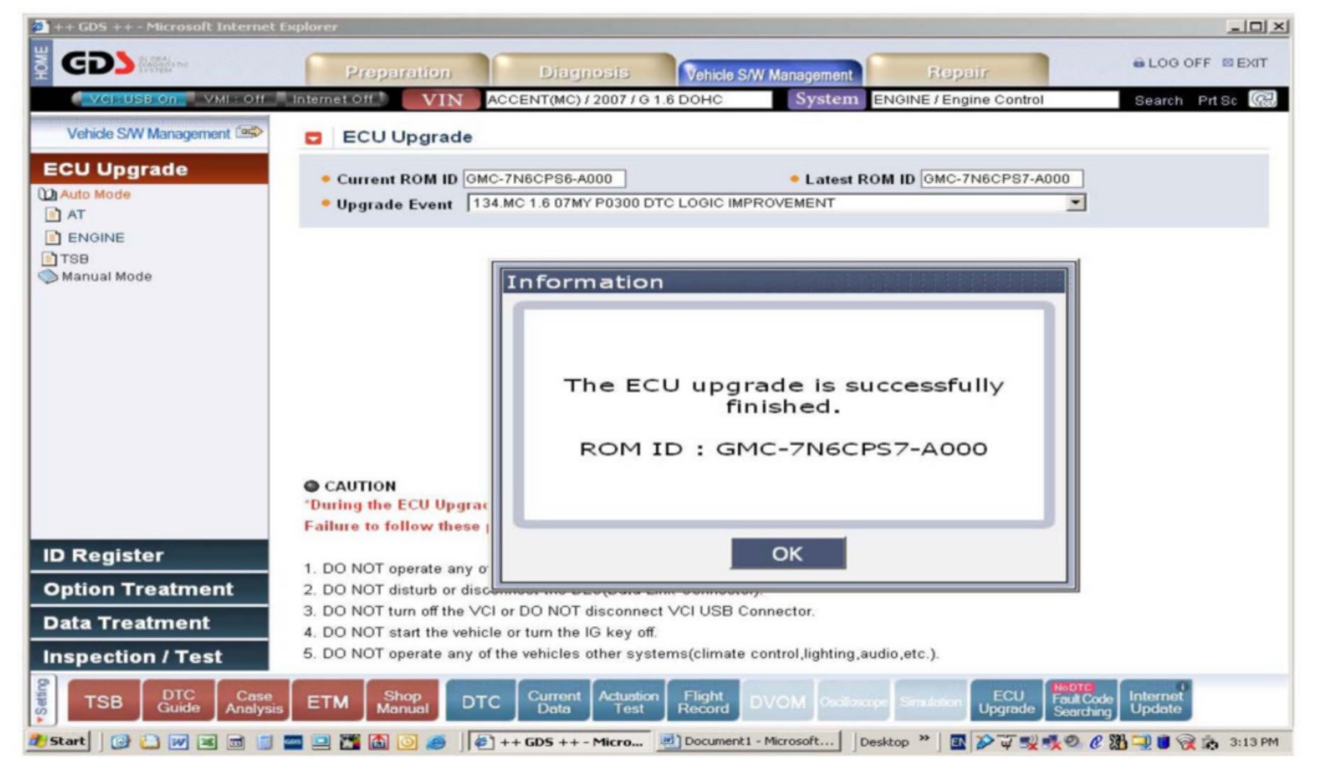 5. Update will occur until 100% is reached on the bar graph. Turn the ignition key OFF for 10 seconds, place it back in the ON position and then click OK to continue according to Information displayed on the screen.