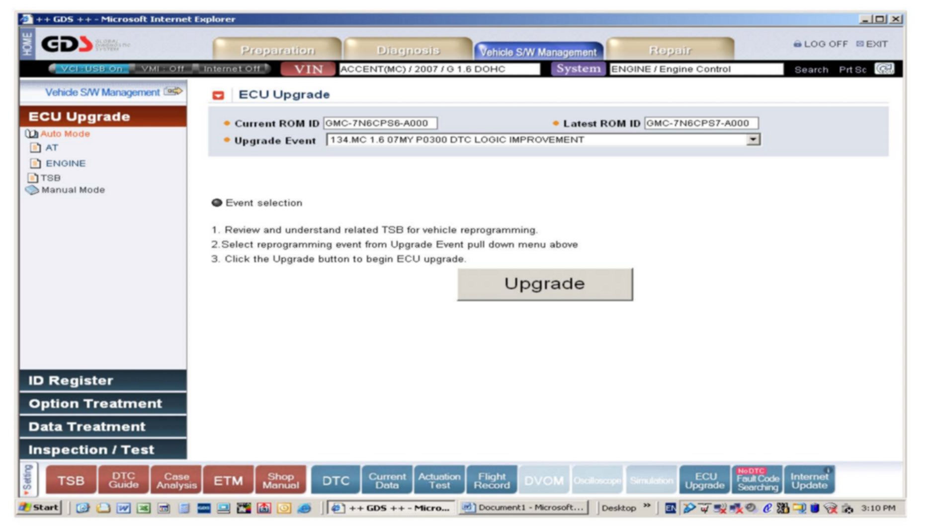 This bulletin provides the procedure to update the Engine software to address 2007 ACCENT (MC) 1.6L vehicles which may experience rough idling during the initial cold start-up period and illuminate the Malfunction Indicator Lamp (MIL) with DTC P0300.