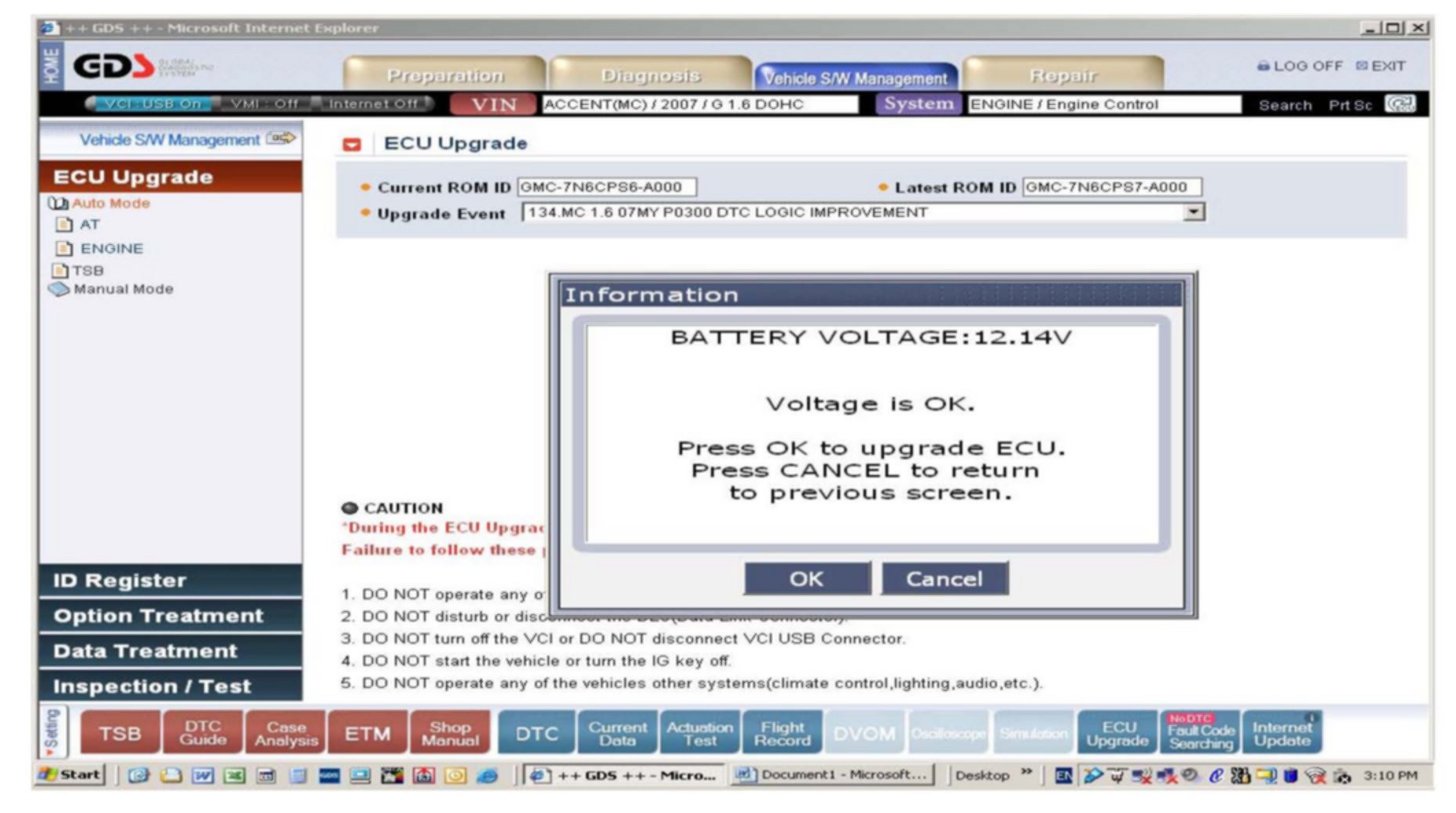 NOTE: - If voltage is below 12 volts, click Cancel and then run the engine to ensure an adequate battery charge state for reliable update results.