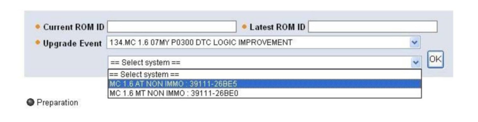 7. After the Current ROM ID is displayed, select the Update Event, "134. MC 1.6 07MY P0300 DTC LOGIC IMPROVEMENT."