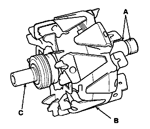 2. Check that there is no continuity between the slip rings and the rotor (B) or rotor shaft (C).