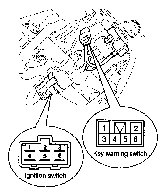 1. Disconnect the ignition switch connector and key warning switch connector from under the steering column.