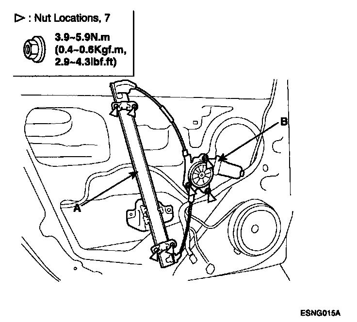 4. After disconnecting window motor connector (B), loosen the door regulator mounting nuts and window motor mounting nuts, remove the door regulator (A).