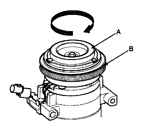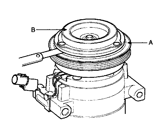2. Check the pulley (B) bearing play and drag by rotating the pulley by hand. Replace the clutch set with a new one if it is noisy or has excessive play/drag.