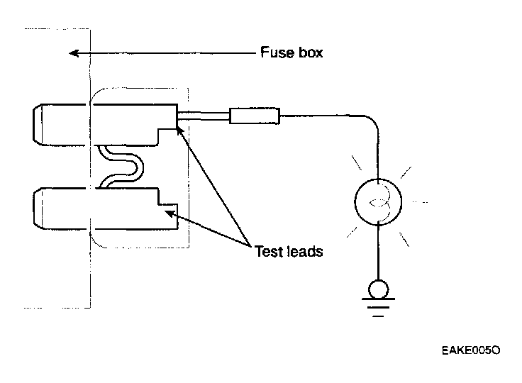 A blade type fuse test taps is provided to allow checking the fuse itself without removing if from the fuse box. The fuse is good if the test lamp lights up when one lead is connected to the test taps (one at a time) and the other lead is grounded. (Turn the ignition switch so that the fuse circuit becomes operative)