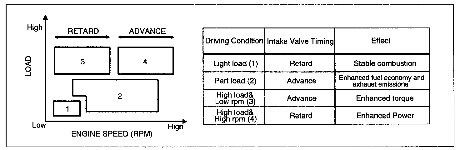 The intake valve timing is optimized by CVVT system depending on engine rpm. This CVVT system improves fuel efficiency and reduces NOx emissions at all levels of engine speed, vehicle speed, and engine load by EGR effect because of valve over-lap optimization.