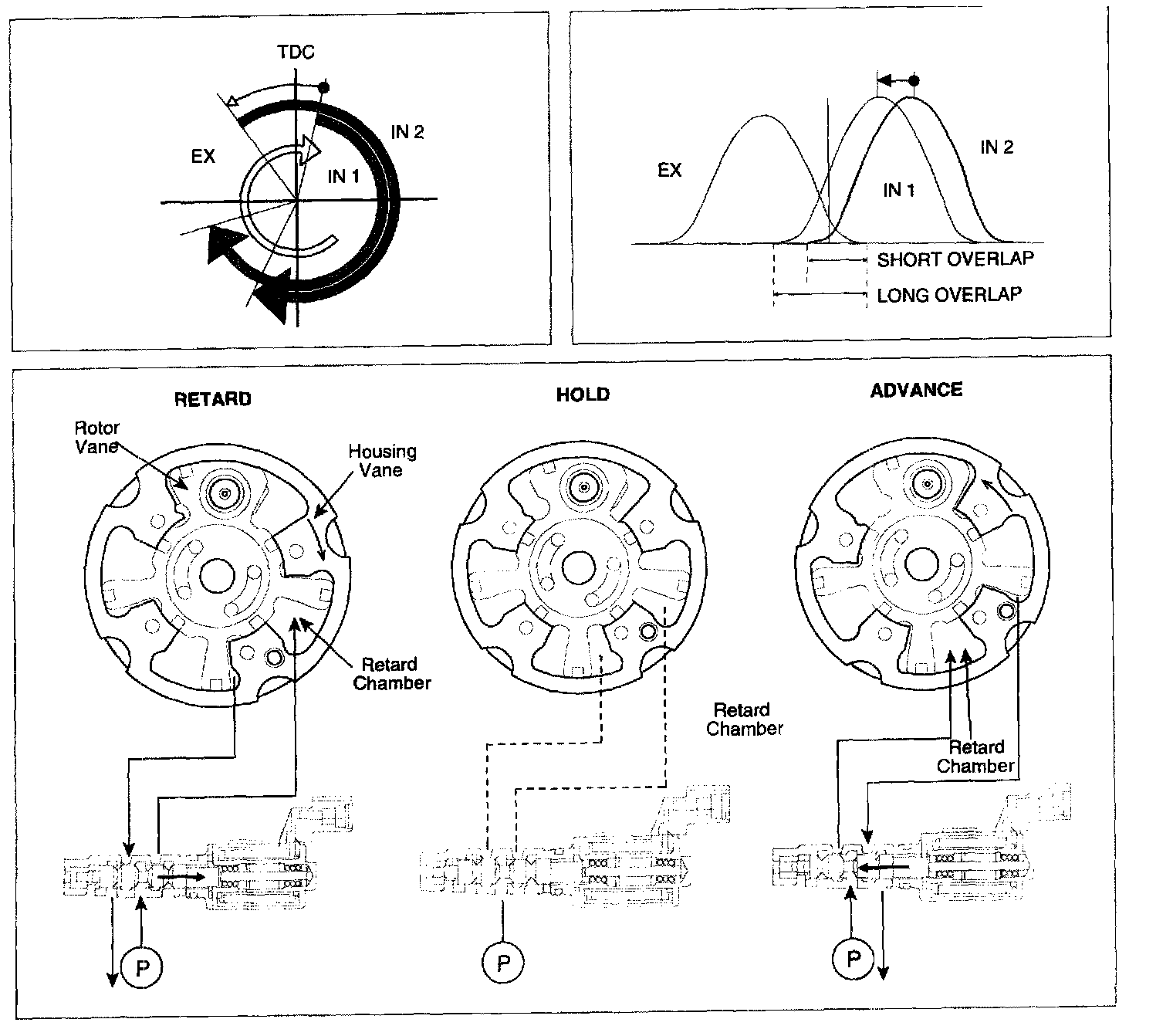 The CVVT changes the phase of the intake camshaft via oil pressure.