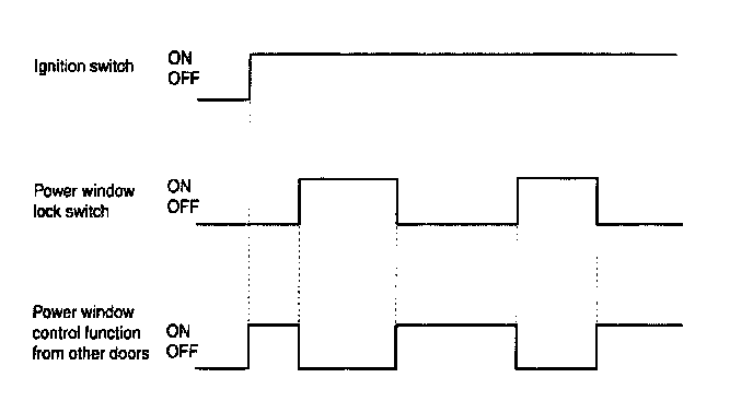 When the driver's power window lock switch is ON, each safety window ECU receives the power window lock command to prohibit the operation by the passenger side doors except the driver's door.
