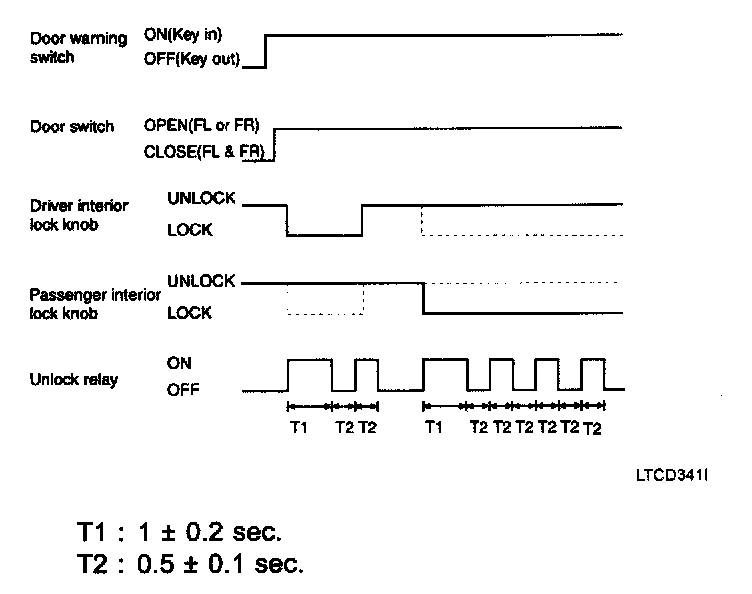 1. If the door switch of driver side or passenger side is locked when door warning switch is turned on and (CAN communication reception), driver side or passenger side door is open, it executes unlock output for 1 second. If the passenger side door remains locked even after the unlock output, it repeats on and off 3 times with the time interval of 0.5 seconds.