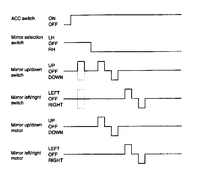If the mirror direction switch (up, down, left and right) is pressed when mirror selection switch on driver side power window switch is in outside LH under ACC ON condition, then mirror motor moves to the corresponding direction.