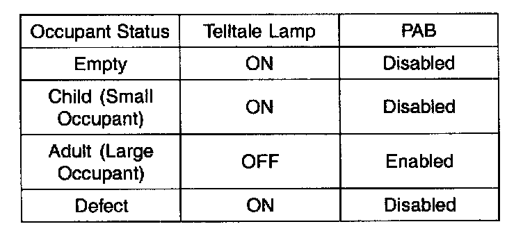 The Telltale Lamp indicates the Passenger Airbag (PAB) enabled and disabled status based on occupant status of passenger seat. If the passenger seat is empty or occupied with child (or child seat), the Passenger Airbag is disabled and the Telltale Lamp is turned ON to inform the driver that the PAB is disabled. As soon as operating voltage is applied to the SRSCM ignition input, the SRSCM activates telltale lamp prove out. OCS will send an defect status to the SRSCM as a default setting for passenger airbag deployment during the prove out period. Occupant status information and telltale status are as above table.