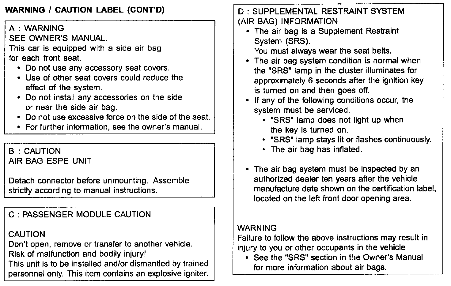 Air Bag Warning / Caution Label (Continued):