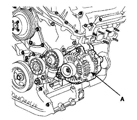 4. Pull out the through bolt and then remove the alternator (A).