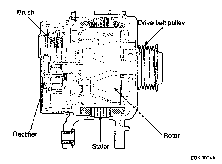 Therefore, DC current appears at alternator "B" terminal. In addition, the charging voltage of this alternator is regulated by the battery voltage detection system. The main components of the alternator are the rotor, stator, rectifier, capacitor brushes, bearings and V-ribbed belt pulley. The brush holder contains a built-in electronic voltage regulator.