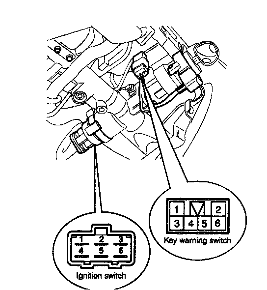 1. Disconnect the ignition switch connector and key warning switch connector from under the steering column.