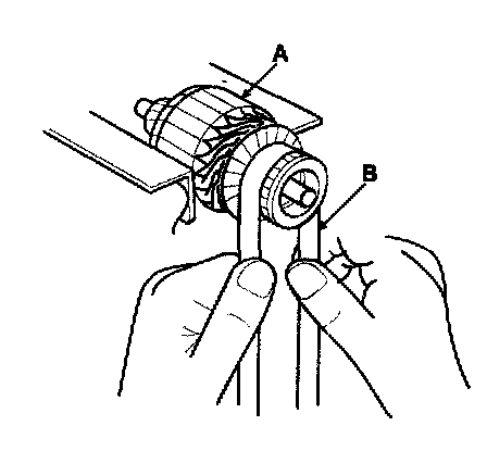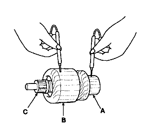 8. Check with an ohmmeter that no continuity exists between the commutator (A) and armature coil core (B), and between the commutator and armature shaft (C). If continuity exists, replace the armature.