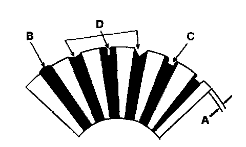 6. Check the mica depth (A). If the mica is too high (B), undercut the mica with a hacksaw blade to the proper depth. Cut away all the mica (C) between the commutator segments. The undercut should not be too shallow, too narrow, or v-shaped (D).