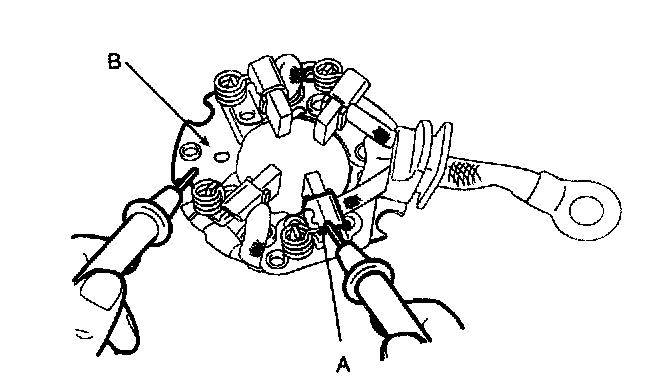 1. Check that there is no continuity between the (+) brush holder (A) and (-) brush holder (B). If there is no continuity, replace the brush holder assembly.