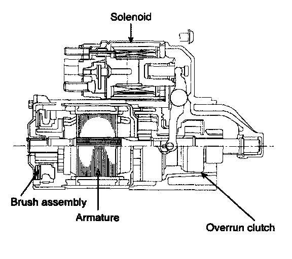 The contacts close and the starter motor cranks. In order to prevent damage caused by excessive rotation of the starter armature when the engine starts, the clutch pinion gear overruns.