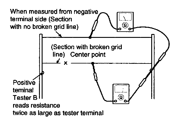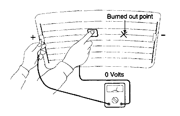 5. Use an ohmmeter to measure the resistance of each heater line between a terminal and the center of a grid line, and between the same terminal and the center of one adjacent heater line. The section with a broken heater line will have a resistance twice as that in other sections. In the affected section, move the test lead to a position where the resistance sharply changes.