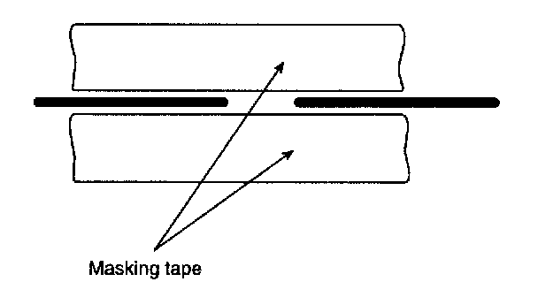 Wipe the glass adjacent to the broken heater line, clean with silicone remover and attach the masking tape as shown. Shake the conductive paint container well, and apply three coats with a brush at intervals of about 15 minutes apart. Remove the tape and allow sufficient time for drying before applying power. For a better finish, scrape away excess deposits with a knife after the paint has completely dried. (Allow 24 hours).