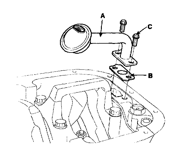 Remove the 2 bolts (C), oil screen (A) and gasket (B).