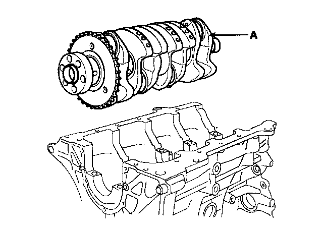 19. Lift the crankshaft (A) out of the engine, being careful not to damage journals.