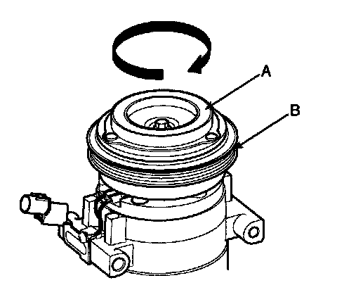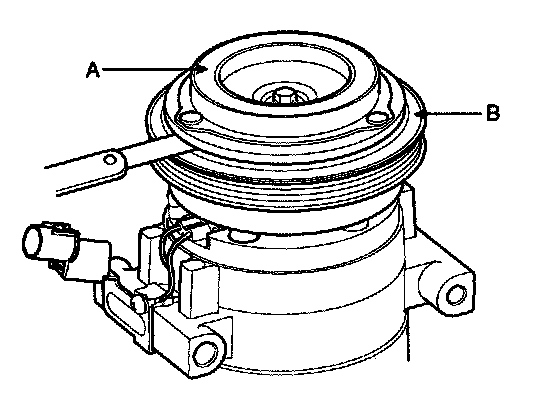 2. Check the pulley (B) bearing play and drag by rotating the pulley by hand. Replace the clutch set with a new one if it is noisy or has excessive play/drag.